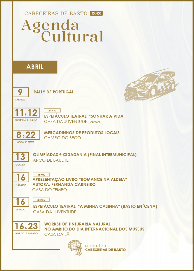 até 03 maio - Exposição «Artes e Ofícios»até 30 junho - Concurso de Fotografia «Mosteiro de S. Miguel de Refojos [IN]visível»até 31 dezembro - Recolha de Monos e Resíduos de Grande Dimensão09 de maio - Vodafone Rally de Portugal - Cabeceiras de Basto11 de maio - Teatro: «Sonhar a Vida»29 de maio - Feira do Livro 2026